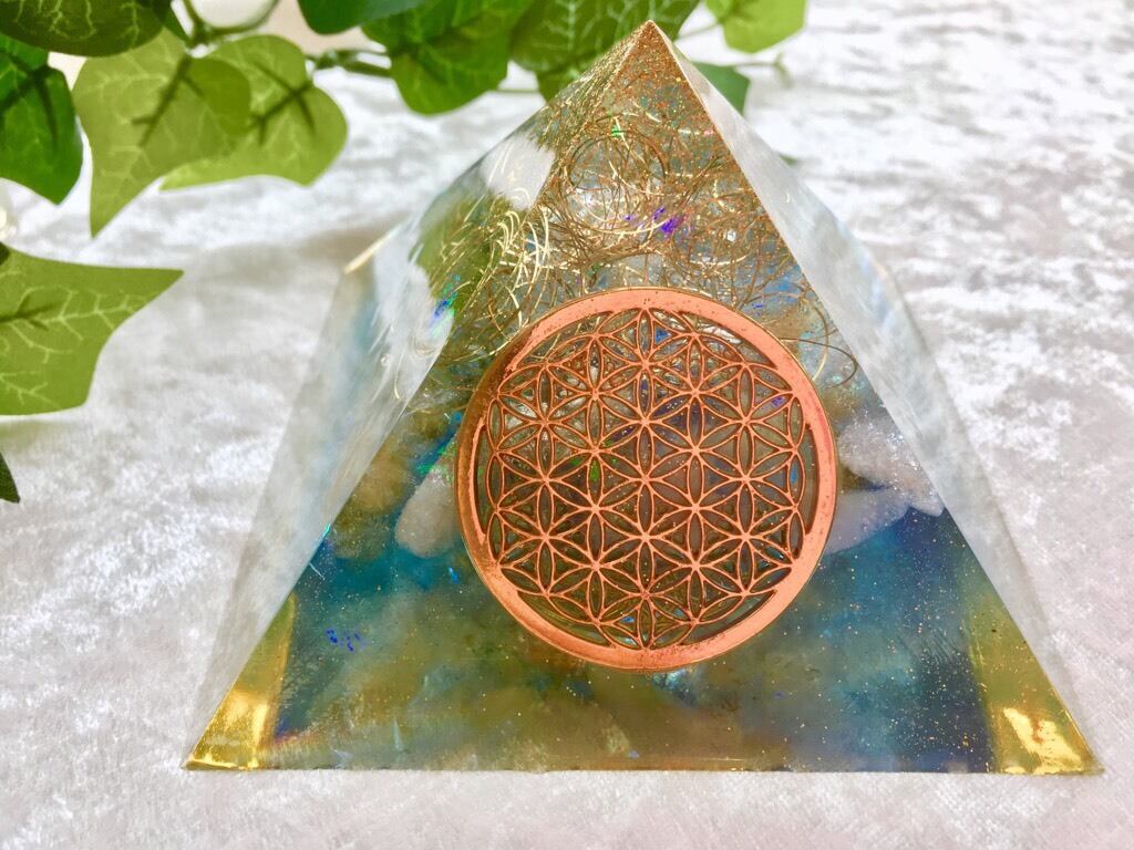 活性化のエネルギーを持つ「フラワーオブライフ」と調和のエネルギー「シュリヤントラ」のチャームが入ったオルゴナイト。豊かさと繁栄の石「シトリン」が入っています。